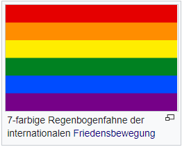 befindet sich das Abbild einer LGBT*-Flagge mit 6 Farblinien mit der Unterschrift: „7-farbige Regenbogenfahne der internationalen Friedensbewegung“.