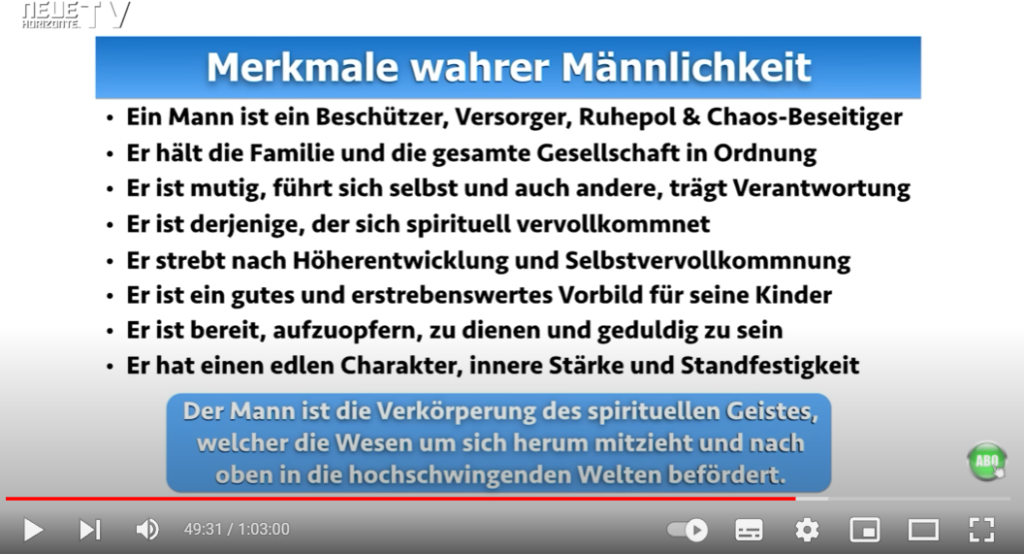 Bei Minute 49 wird eine Übersicht „Merkmale wahrer Männlichkeit“ eingeblendet, die ich hier als Screenshot einbette: