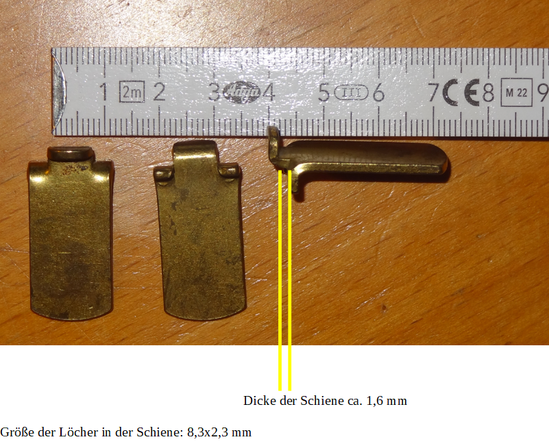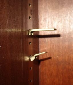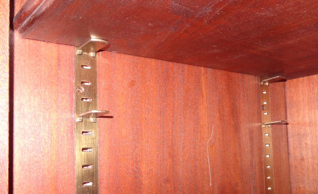Mein Problem ist nun, daß moderne Bodenträger ähnlicher Bauart nicht in diesem alten Schrank passen. Es liegt wohl daran, daß früher dickere Schienen verbaut wurden und heutzutage eher dünnes Blech genommen wird. Das heißt, neuere Bodenträger lassen sich nach dem Einstecken nicht in die Waagerechte kippen.
