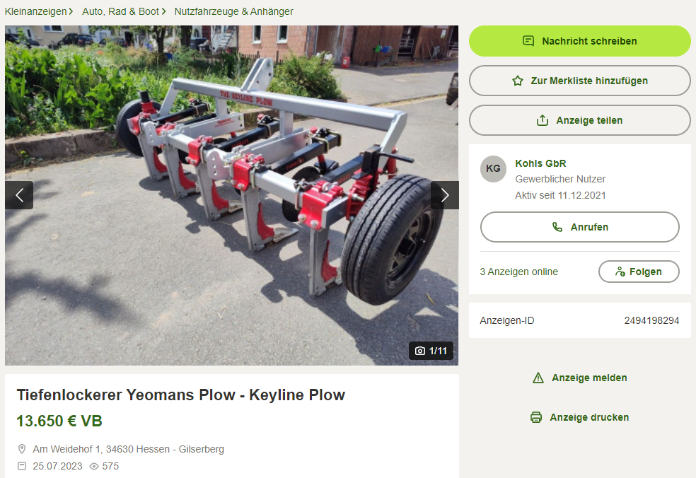 Der Anbieter ist die Firma Bodenbalance in Gilserberg. Diese Firma hat aktuell 2 Yeomans im Einsatz und einen im Angebot. Sie bestellen ab und an in Australien und haben eine kleine Auswahl an Ersatzteilen im Vorrat. Auf jeden Fall können Interessenten am Yeomans-Pflug statt in Australien auch in Gilserberg anfragen.