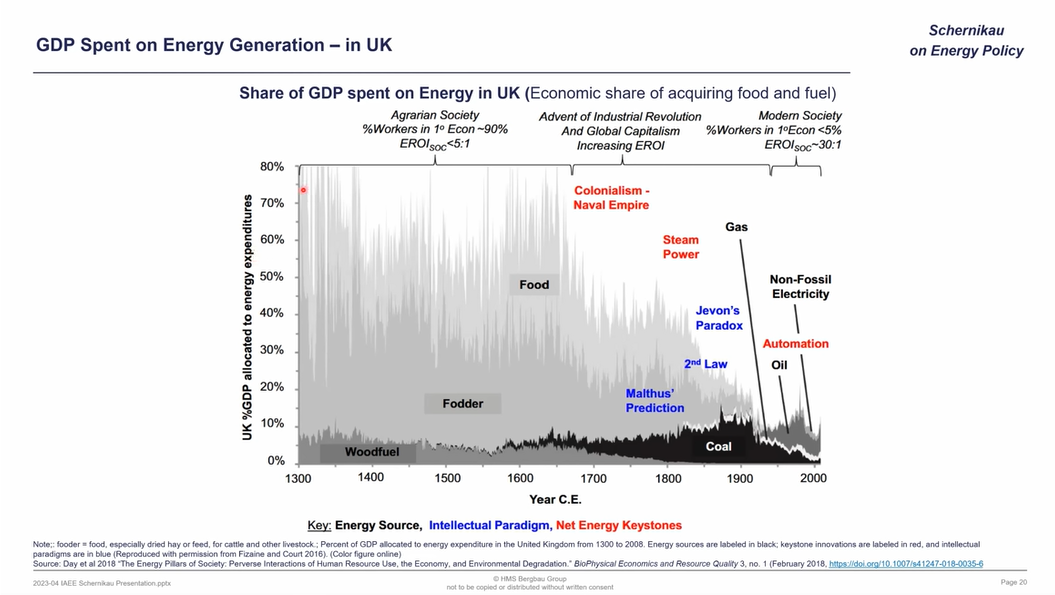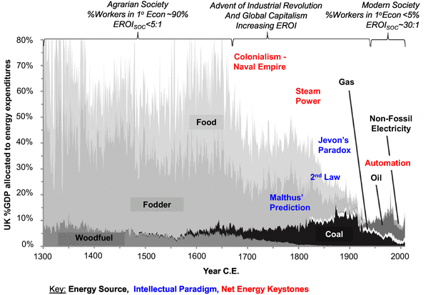 Mit der Kolonialisierung, der Dampfmaschine und der Industrialisierung hat sich dies grundlegend gewandelt, so daß die moderne Gesellschaft nur noch ca. 10% des Aufwandes für Wärme und Nahrung aufwendet. (Das beantwortet nicht die Frage ob die neu gewonnenen „Freizeit“ sinnvoll genutzt wird)