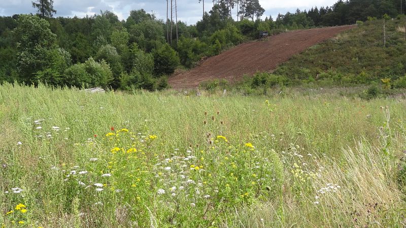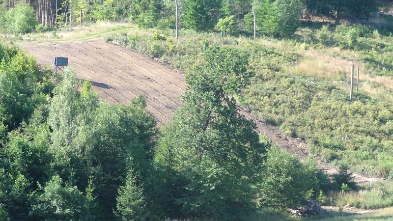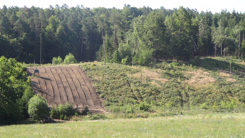 Seit einiger Zeit beobachte ich, von geringer Entfernung aus, die Entwicklung eines Waldstückes. Vor kurzem starben dort die Bäume durch Trockenheit, Windbruch usw. Mit schwerem Gerät wurde alles Holz abgefahren und die Fläche verbuschte. Vermutlich wollte die Forstverwaltung, daß neu aufgeforstet wird. Auf jeden Fall war plötzlich ein Teilstück dieser Buschland-Fläche komplett ohne Bewuchs, blanke Erde wurde sichtbar. Das spezielle an diesem Waldstück ist die Neigung. Die Hanglage ist beträchtlich. Wie man auf dem Bild sehen kann wurde hangabwärts bearbeitet: