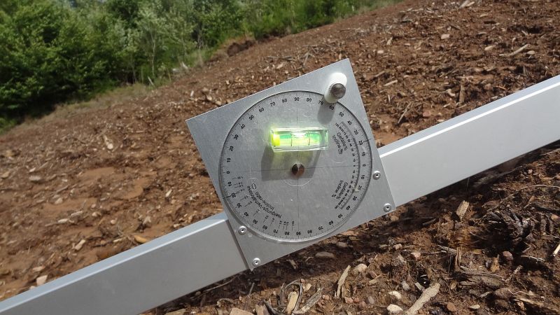 Mit Hilfe einer mitgebrachten Neigungswasserwaage habe ich das Gefälle gemessen: ungefähr 20°, das entspricht ca. 35% Gefälle!