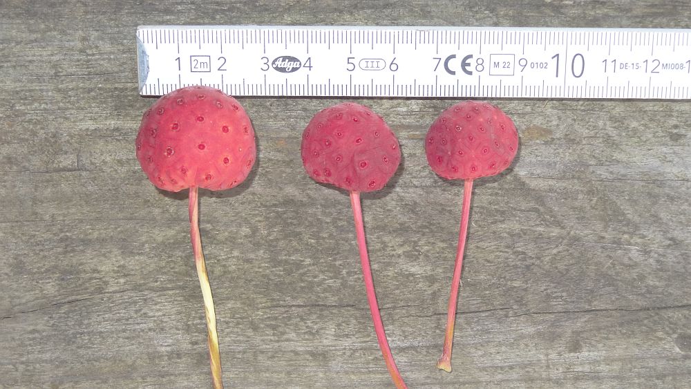 Nun ist es soweit, die Sorte ‚Satomi‘ gehört von dieser Auswahl mit Abstand zu der frühesten Sorte. Sie hat dieses Jahr viele Früchte angesetzt. Und diese Früchte schmecken lecker! Es sind ein paar kleine Kerne enthalten, die man ausspucken oder auch schlucken kann. Die Schale kann mitgegessen werden. Die Früchte sind überwiegend im Bereich von 2 cm Durchmesser. Eine Frucht erreichte 3 cm Durchmesser. Auch wenn ich es noch nicht probiert habe, gehe ich davon aus, daß Marmelade (Kerne abtrennen mit flotter Lotte) oder auch Schnaps eine interessante Weiterverarbeitung wäre.