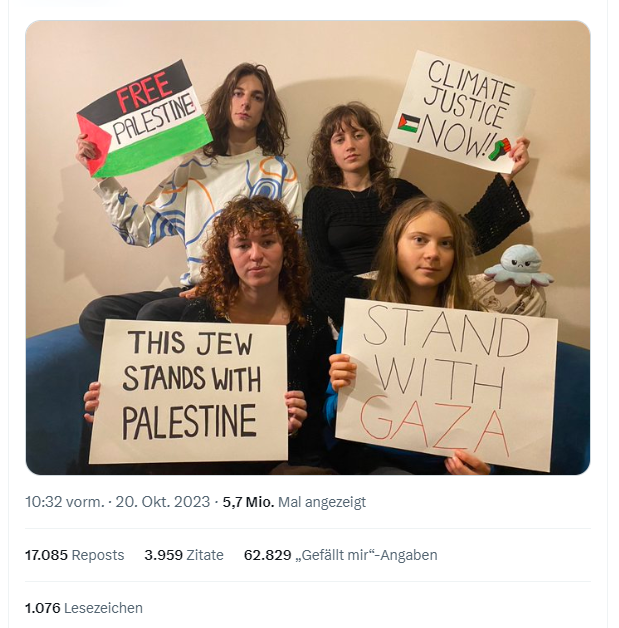 Greta Thunberg hat am 27.10. bei X (Twitter) ein Bild geteilt mit eindeutiger Positionierung für eine Befreiung von Palästina. Das obige Bild ist also kein versehentlicher Ausrutscher, sondern Greta (bzw. ihr Manager) hat diese Haltung gegen Israel bekräftigt: