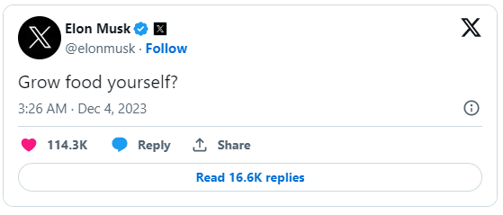 Vor wenigen Stunden schreibt Elon Musk auf X (Twitter) die Frage ob man Essen selber anbaut: