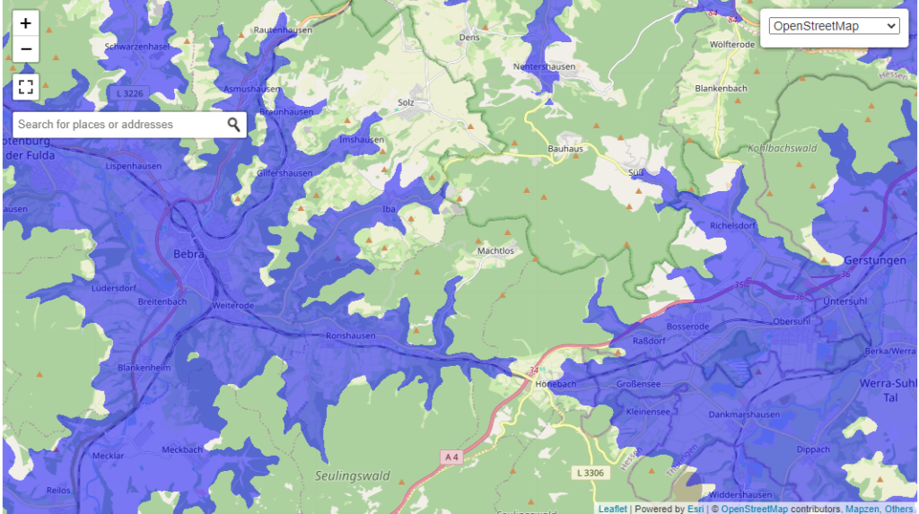 Geht man etwas ins Detail meiner Region, dann sieht man, daß das Dorf Bauhaus auf einer Halbinsel sicher im Trockenen bleibt und angenehmerweise bei Hönebach noch eine schmale Verbindung zum Festland im Süden bleibt. Unser Nachbardorf Süß wäre schon am Meer gelegen… welch skurrile Vorstellung…