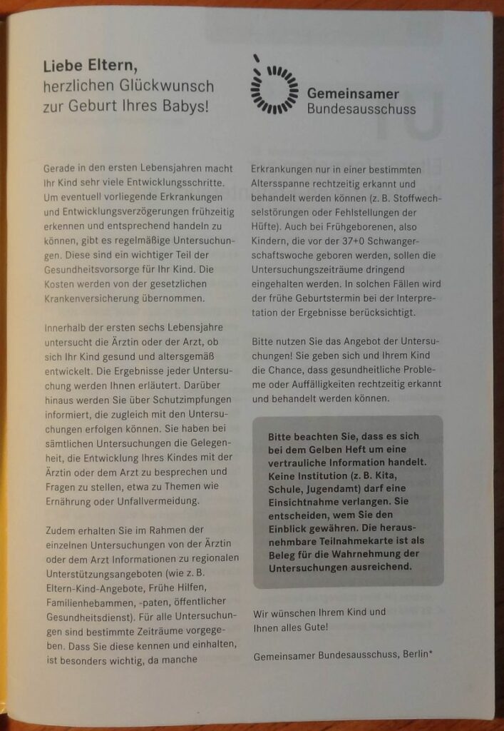 „Bitte beachten Sie, dass es sich bei dem Gelben Heft um eine vertrauliche Information handelt. Keine Institution (z.B. Kita, Schule, Jugendamt) darf eine Einsichtnahme verlangen. Sie entscheiden, wem Sie den Einblick gewähren. Die Herausnehmbare Teilnahmekarte ist als Beleg für die Wahrnehmung der Untersuchungen ausreichend.“