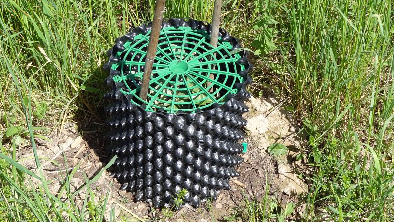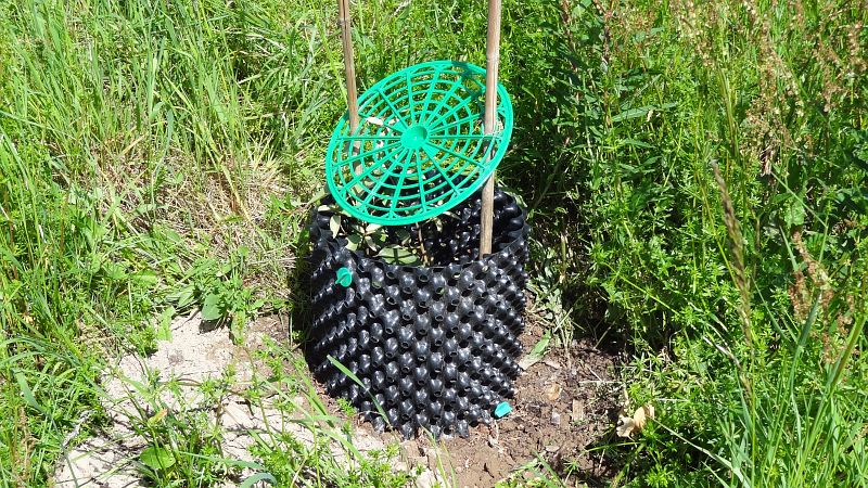 Jungbäumchen haben wir auch so ähnlich geschützt mit einem kleinmaschigen Drathzaungitter und mit 2 Stäben fixiert. Das umgebende Gras war dabei so schnell gewachsen, dass wir die Bäumchen ohne die Stäbe vermutlich abgemäht hätten.
